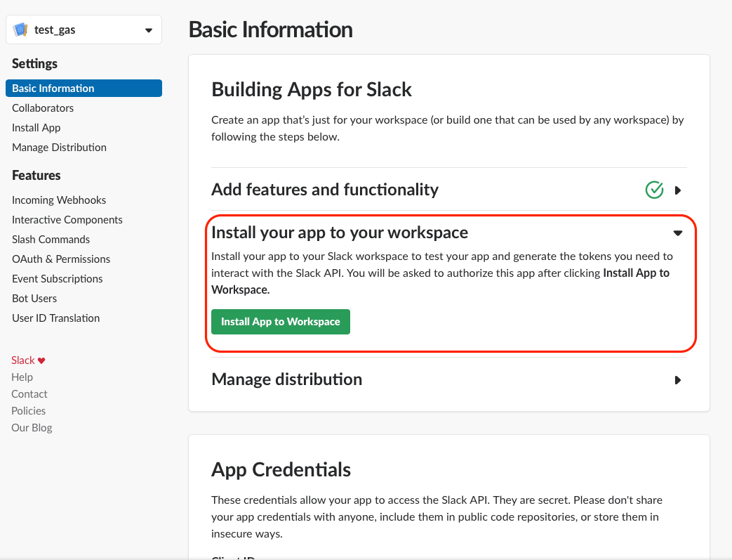 Settingsの「Basic Information」から「Install your app to your workspace」の