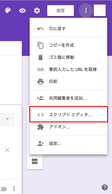 Googleフォームの場合、右上の三点リーダー部分からスクリプトを起動できます。