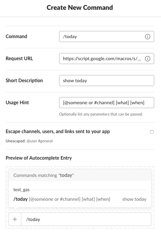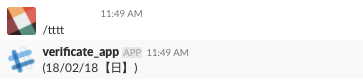 以上のことをやった上で、Slackで /todayというコマンドを打ってみます。